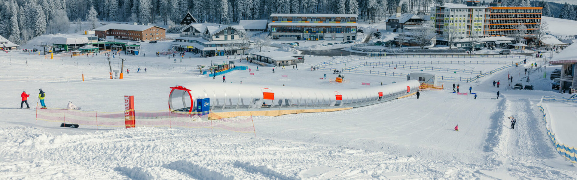 Für eine komfortable Auffahrt sorgt bei sowohl Schneetreiben als auch Wind eine Evolus-Galerie, die ebenso die Umlenkstation wie den Antrieb mitüberdacht. Die Galerie ist mittels roter, zum Corporate Design der Feldbergbahnen passender PVC-Rollplanen am unteren wie oberen Ende des Förderbandes verschließbar. So gelangt über Nacht kein Schnee auf den Zauberteppich – und ein schneller und unkomplizierter Betriebsstart ist jederzeit gesichert.