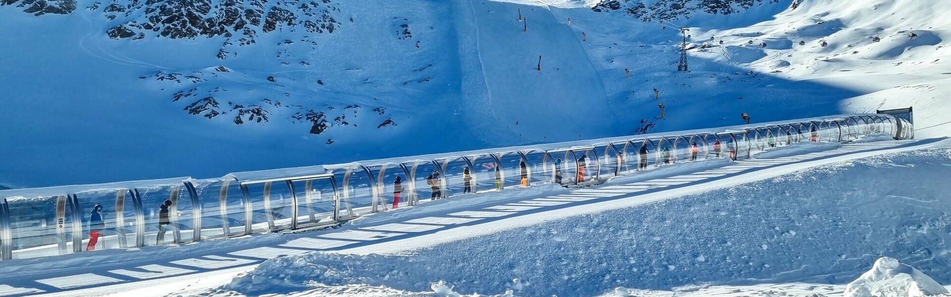 Zur Überbrückung dieses Höhenunterschiedes prüften die Ötztaler Gletscherbahnen verschiedene Logistiklösungen und entschieden sich letztendlich für einen 174m langen Zauberteppich als Verbindungsband.