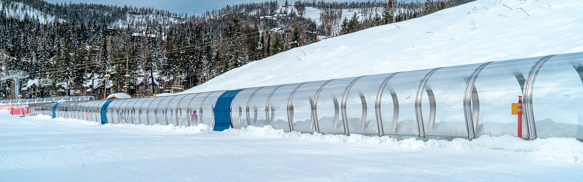 Die EVOLUS-M-Galerie bietet allen Skianfängern eine komfortable – vor Wind und Wetter geschützte – Auffahrt. Zudem ermöglicht diese dem Betreiber dank Flügeltüren an der Tal- und Bergstation einen schnellen Betriebsstart am Morgen – ohne Schneeräumarbeiten auf dem Band. Zur Optimierung der internationalen Lieferung (Österreich – USA) sowie für einen unkomplizierten Aufbau entschied sich der Kunde für geteilte Galeriebögen. Außerdem ist der gesamte Ausstiegsbereich inklusive Antriebsstation und Bedienterminal mit einer größeren EVOLUS-XL-Galerie überdacht.