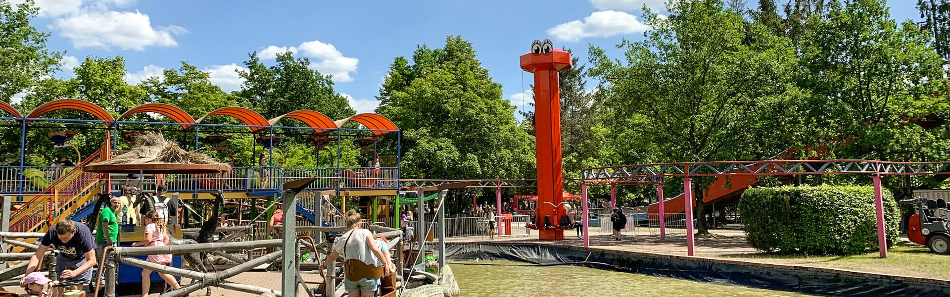 Unifarben, komplett in Rot gehalten und mit zwei großen Cartoon-Augen auf dem Turmkopf ist das interaktive Family Ride aus dem Hause Sunkid nicht zu übersehen. „Sehen“ ist das richtige Stichwort, schließlich ermöglicht der Tower einen Panoramablick über die umliegenden Bereiche und Attraktionen des Parks, wie Schmetterlingbahn, Wasserrondell oder Teppichrutsche.